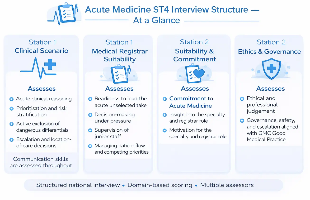 The Acute Medicine ST4 interview uses a structured national scoring system, with each station marked independently by trained interviewers. Candidates are assessed across defined domains using a 1–5 scoring scale, and marks are awarded only for what is clearly demonstrated during the interview.
